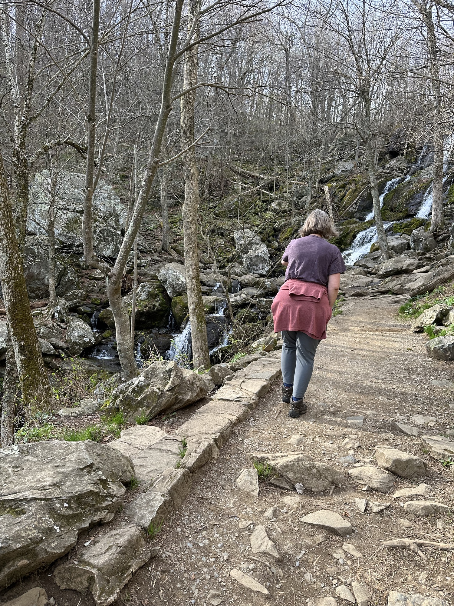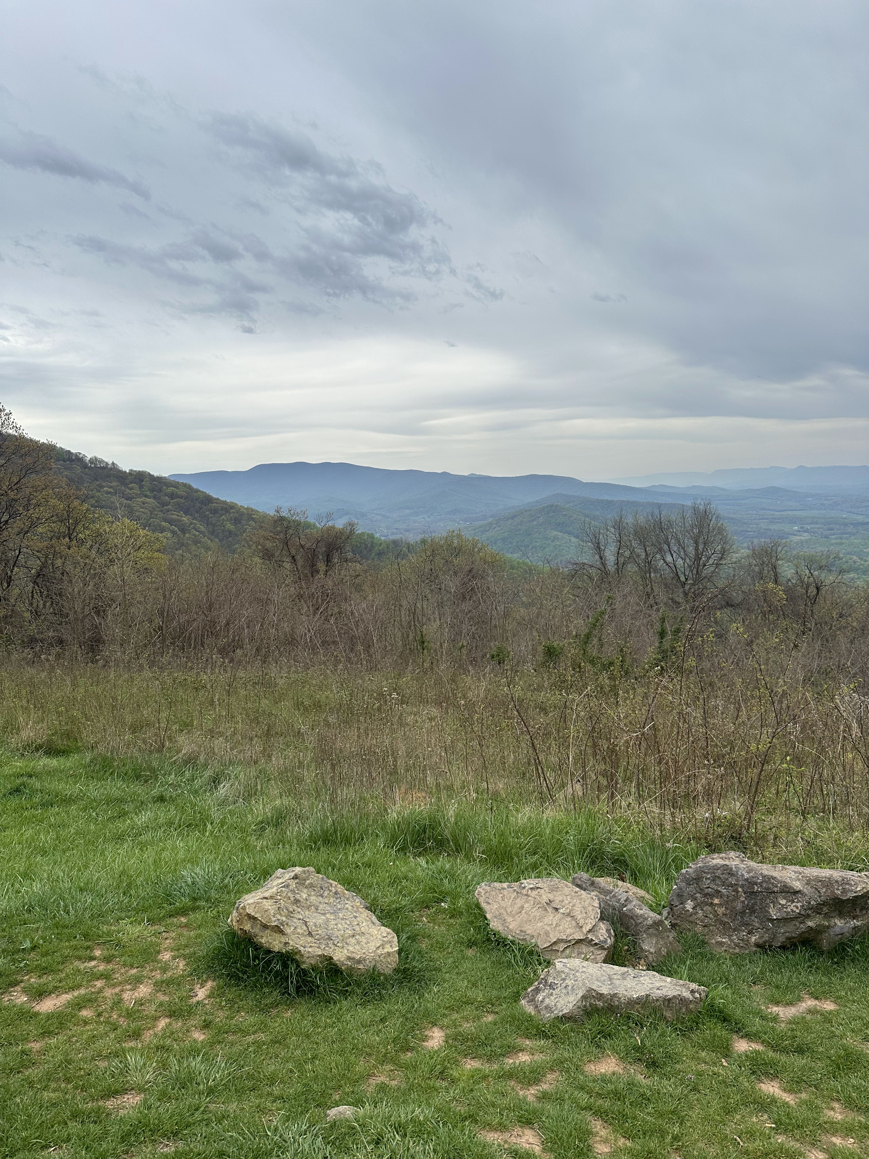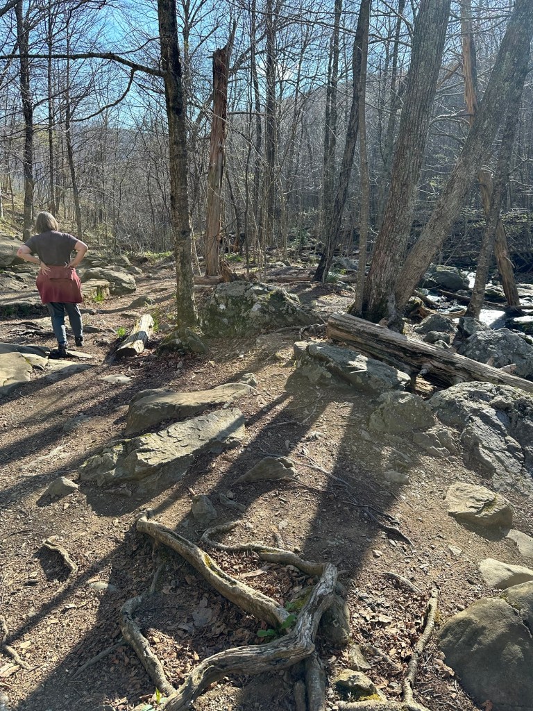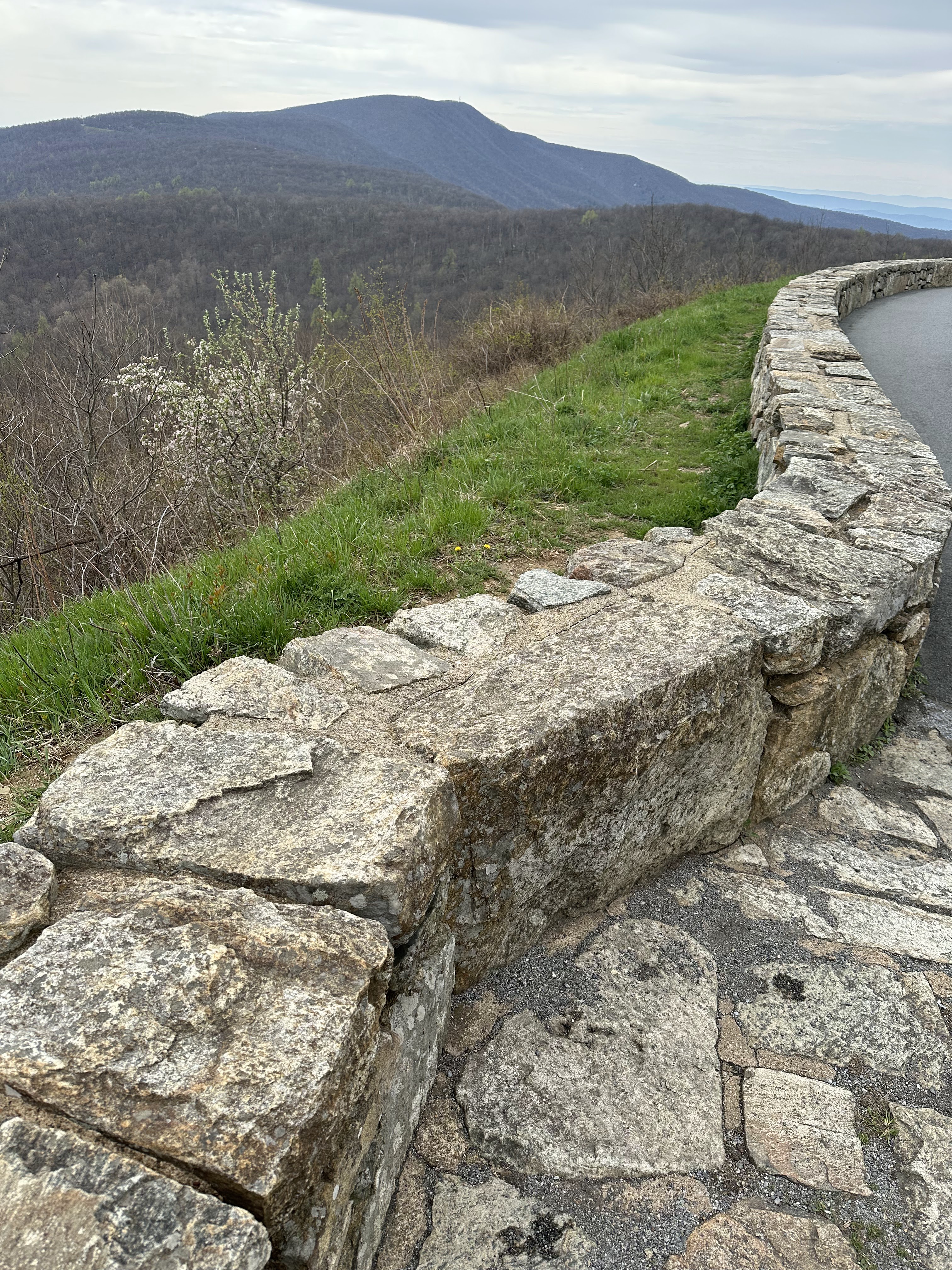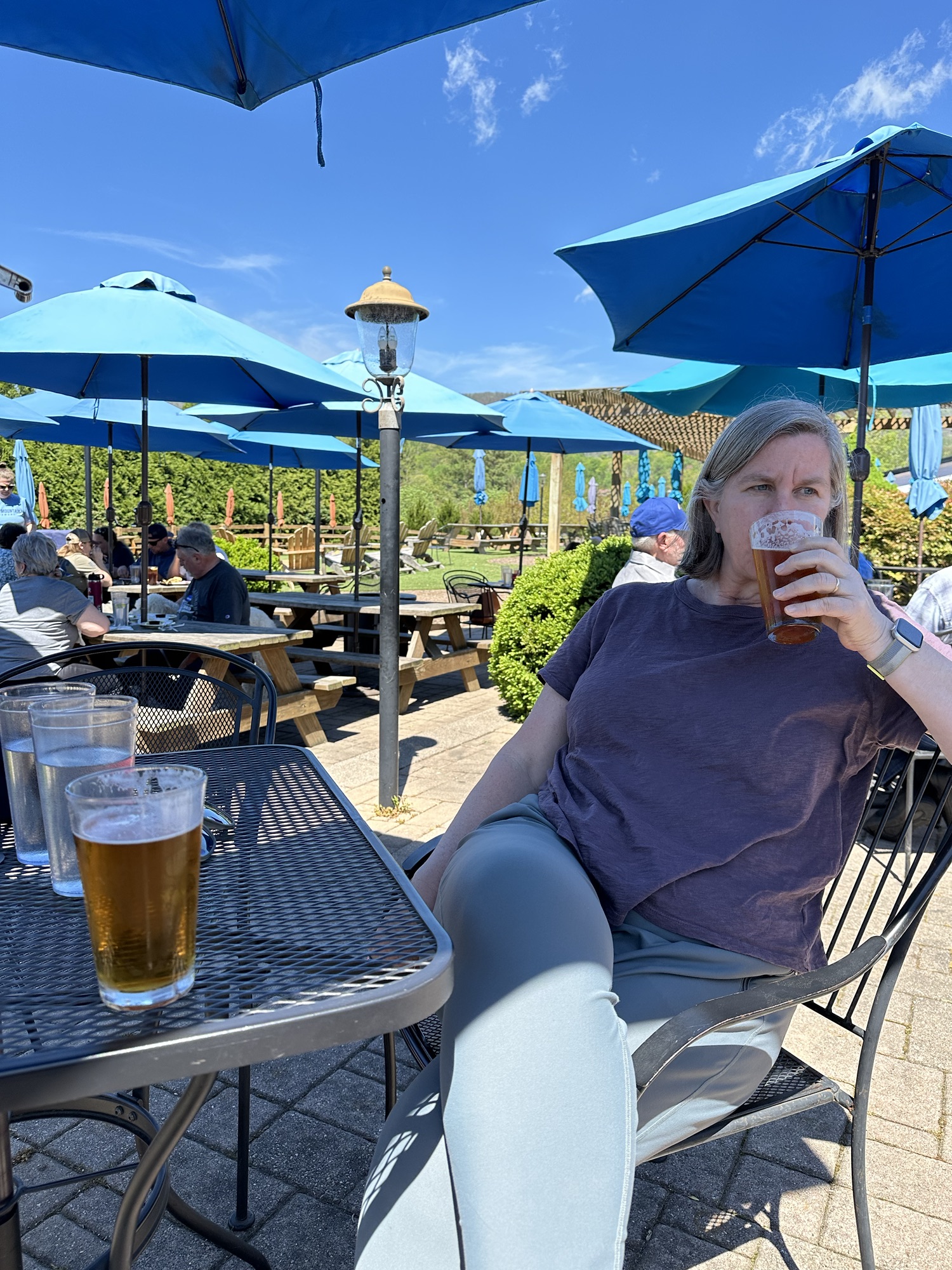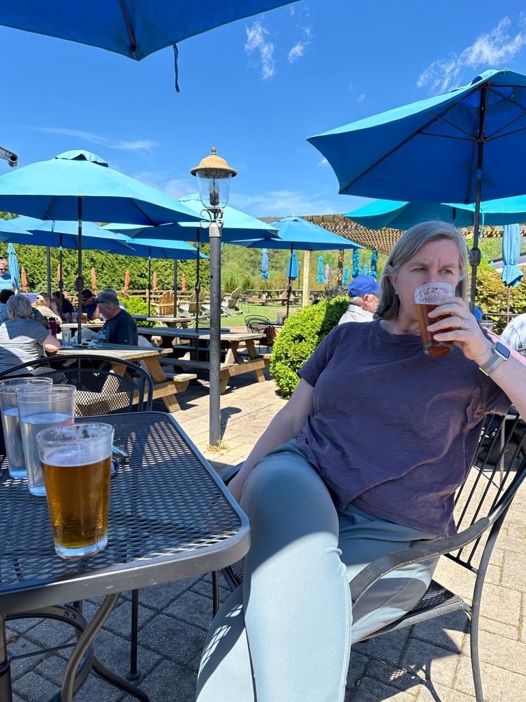 We packed out things up in the morning and went up to the lodge again for breakfast. We split an order of blackberry french toast which was very good. We hit the park again on a beautiful spring morning. We first hiked Dark Hollow Falls trail which was a beautiful trail going down into the valley following a small stream and ending in a nice set of waterfalls. We were worried the hike back up would be rough but we made it no problem. We then hiked the Bearfence Mountain trail which was just the opposite – hiking up up up to a rocky overlook. This was about the only time we saw other people on any of our hikes. It was blessedly almost empty on this off season week day. We continued driving through the park and arrived at Blue Mountain Brewery around 1:00. The brewery was a great place with amazing scenery and it was suddenly 80 degrees and sunny once we were down from the mountains. We had some good beers and a good lunch and then headed back on the road to Roanoke. It took us about two hours to drive to Emily and Dan’s house. Once Dan was done working we headed out to downtown Roanoke and had cocktails and apps at the Liberty Trust – a cool swanky hotel converted from an old bank. We then walked a few blocks to Sidecar – a belgian restaurant where we had an excellent dinner.